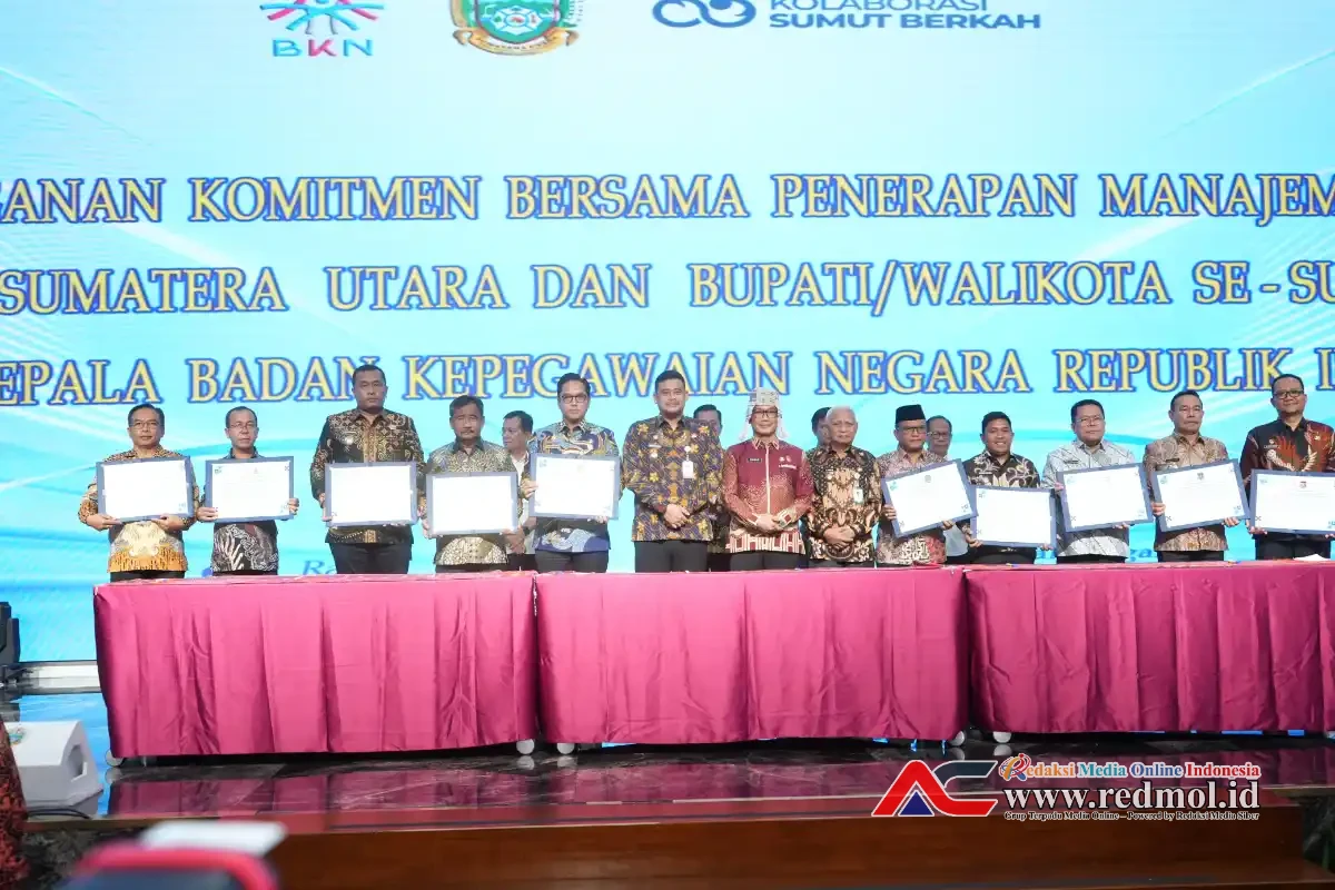 Kegiatan turut dihadiri Wakil Gubernur Sumut H. Surya, B.Sc, Deputi Bidang Pembinaan Penyelenggaraan Manajemen ASN Dr. Herman, M.Si, Kepala BKD Sumut Sutan Tolang Lubis, S.STP, M.SP, serta para kepala daerah dan pejabat BKPSDM se-Sumatera Utara.