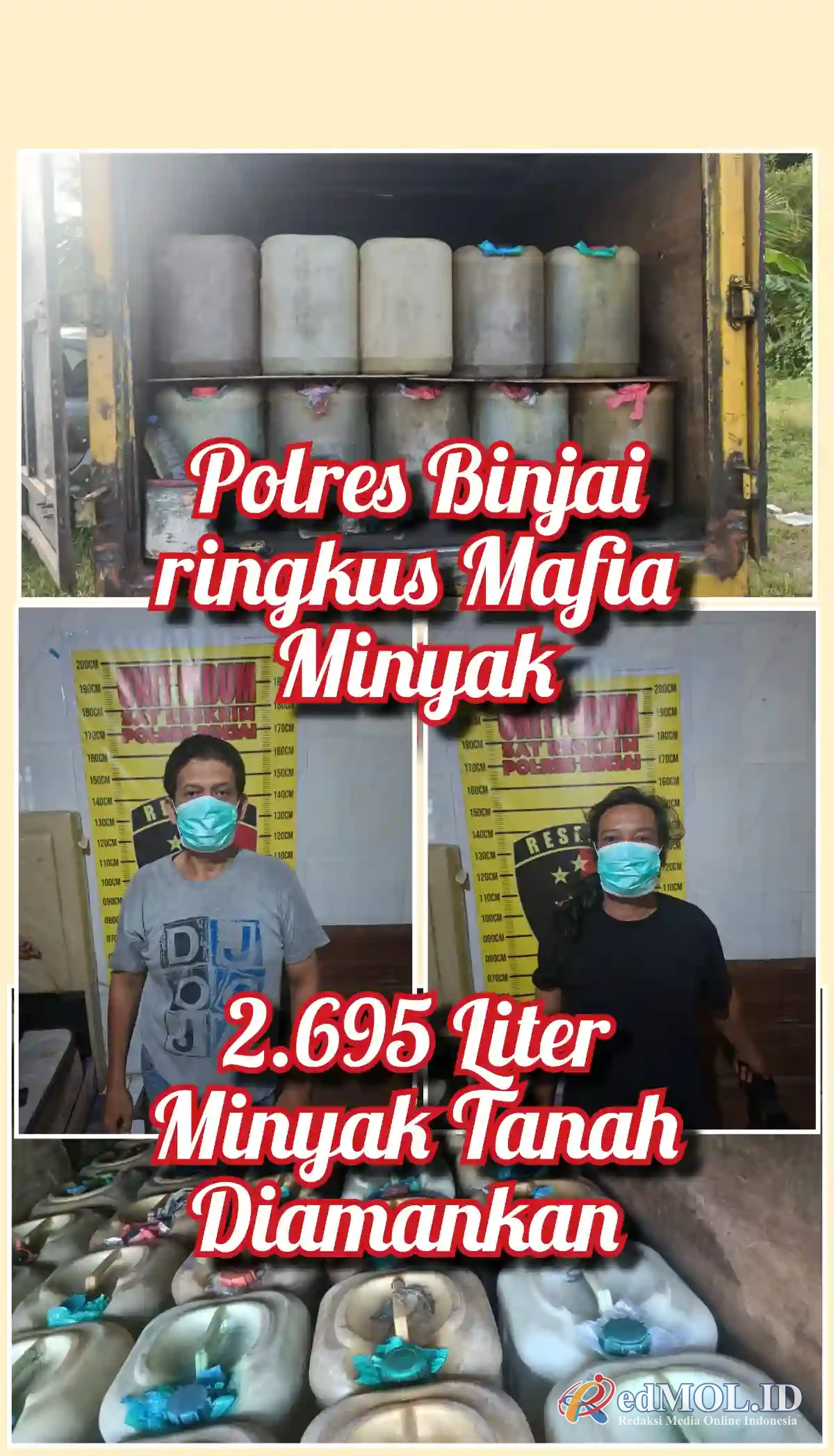 “Saat dilakukan penggeledahan, petugas menemukan 77 jeriken minyak tanah, masing-masing berisi sekitar 35 liter, sehingga total yang diamankan mencapai 2.695 liter,” jelas Hizkia.