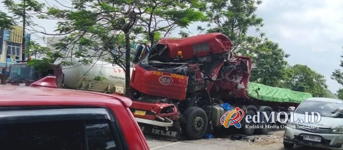 Kecelakaan tersebut melibatkan truk trailer bernomor polisi B 9062 PFX yang dikemudikan Riki Gunawan (32), warga Kabupaten Tegal, dengan truk tronton Fuso BK 8122 BC yang dikemudikan Rahmat (26), warga Kabupaten Labuhanbatu Selatan, Sumatera Utara.